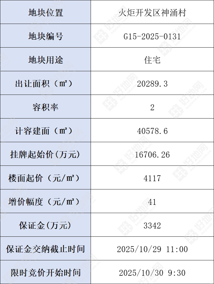 地块起价16706.26万元,楼面起价4117元/㎡,保证金3342万元,到账截止时间10月29日11时。