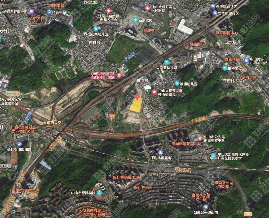 地块位于火炬开发区博凯社区,广澳高速、中开高速围绕,紧邻一宗教育用地,临近保利林语和凯茵新城,可享受这两个超级大盘成熟配套,距离地块直线1公里有三级综合医院——中山市第六人民医院(火炬人民医院),以及西桠公园、华佗山公园两大公园。