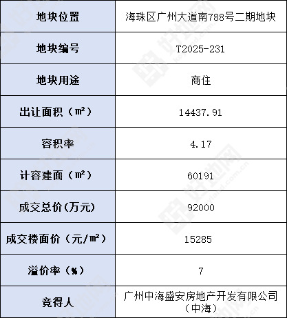 经过7轮竞价,地块最终由广州中海盛安房地产开发有限公司(中海)以92000万元竞得,溢价7%,成交楼面价15285元/㎡,实际楼面价36191元/㎡。