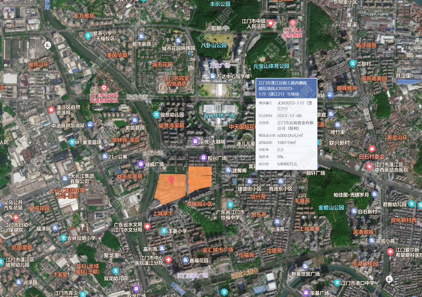 地块位于北新区,拥一线天沙河河景,周边有万达广场、五邑华侨广场、汇悦城、健威广场、利和广场等商业配套,丰泰小学、怡福中学等优质教育资源,江门市妇幼保健院、蓬江区中西结合医院等医疗配套,八卦山公园、元宝山体育公园、丰乐公园、金蟾山公园环伺。