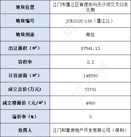 好地网10月11日消息(研究员 黄卓贤)今天,江门出让1宗商住地,位于蓬江区,为丰乐水质净化厂和耙冲三鸟市场地块,最终由江门和誉房地产开发有限公司(保利)以底价73701万元竞得,成交楼面价4960元/㎡。