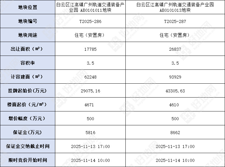 好地网10月15日消息(研究员 黄卓贤)今天,广州挂牌2宗相邻宅地,均为安置房用地,位于白云区江高镇广州轨道交通装备产业园,拟于11月14日10时进行限时竞价。