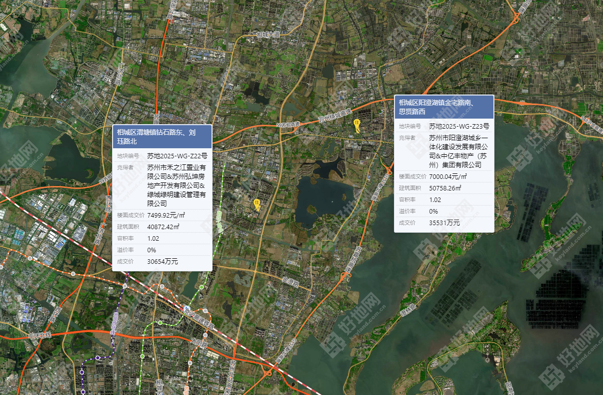 2宗地块分别位于渭塘镇和阳澄湖镇,总出让面积135亩,总建筑面积9.16万方,总成交价66185万元。
