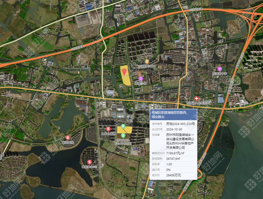 地块南侧800余米处,去年10月30日,苏州市阳澄湖城乡一体化建设发展有限公司&苏州兴华房地产开发有限公司以底价26458万元竞得相城区阳澄湖镇思贤路西、成安路北地块,容积率1.05,楼面价7200元/㎡。
