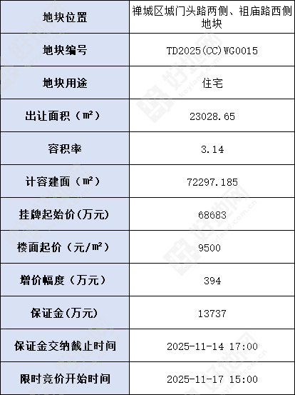 地块起价68683万元,楼面起价9500元/㎡,保证金13737万元,到账截止时间11月14日17时。