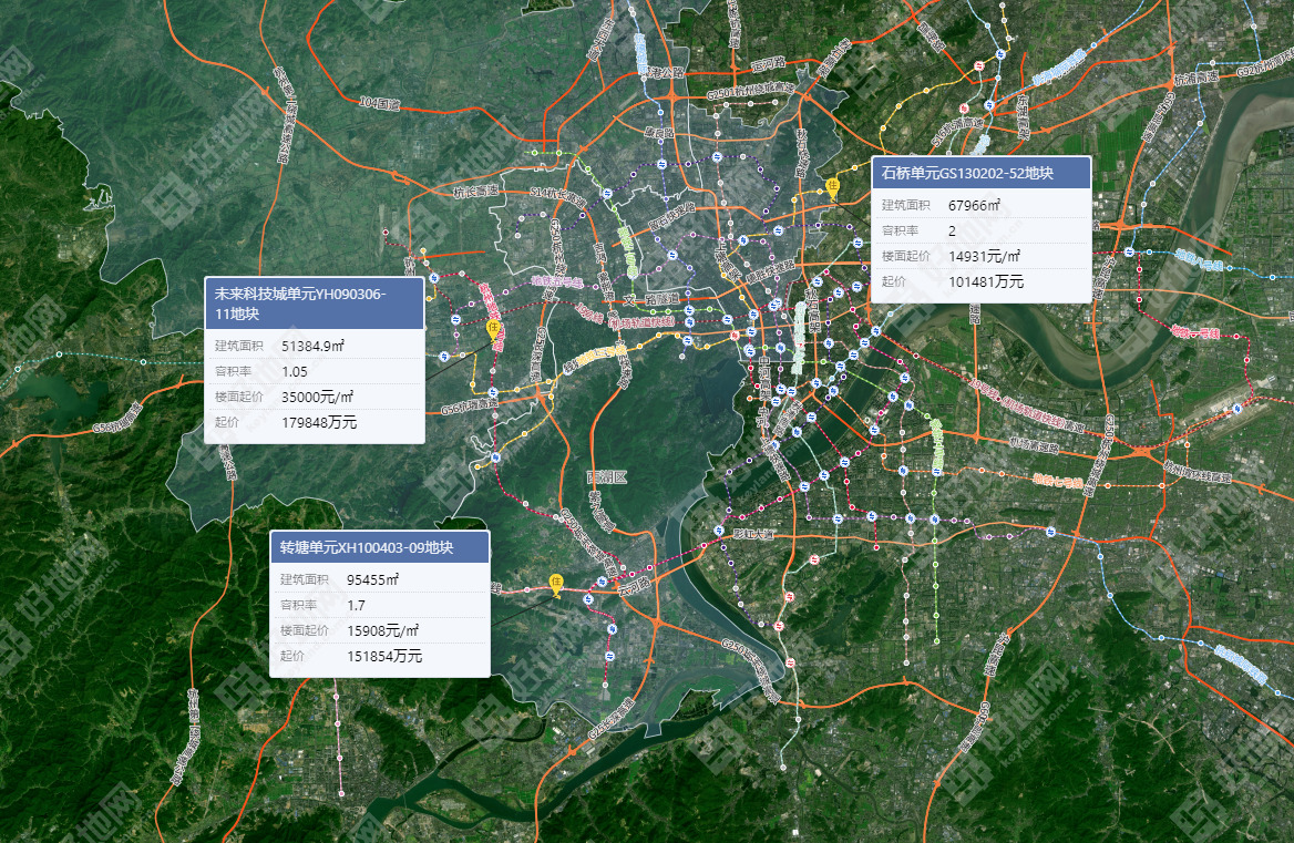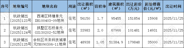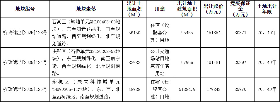3宗地块分别位于西湖区转塘单元、拱墅区石桥单元和余杭区未来科技城,总出让面积208.6亩,总建筑面积21.5万方,总起价43.3亿元。其中: