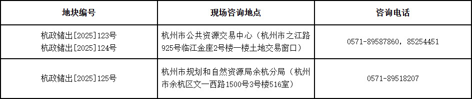 十、挂牌咨询。现场咨询地点设在杭州市公共资源交易中心(杭州市之江路925号临江金座2号楼一楼土地交易窗口),咨询电话:0571-89587860,85254451。