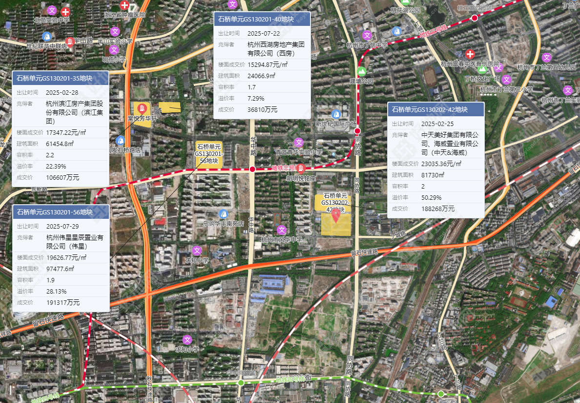 拱墅区石桥宅地距离地铁3号线华丰路站、同协路站约700余米,容积率2.0,建筑面积6.8万方,起始楼面价14931元/㎡。地块北侧一路时隔是中天海威今年2月25日竞得的璟逸项目(地价23035元/㎡,溢价率50.3%),目前尚未开盘,