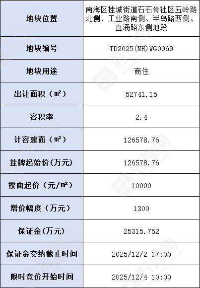 地块起价126578.76万元,楼面起价10000元/㎡,保证金25315.752万元,到账截止时间12月2日17时。