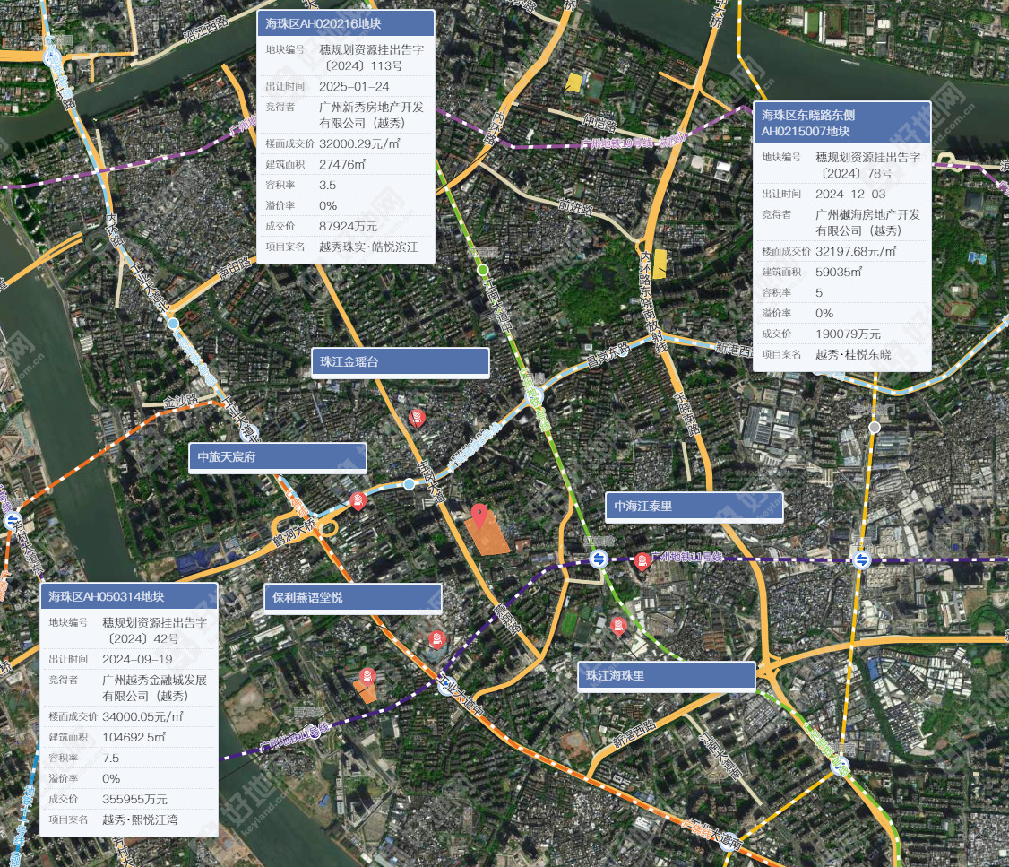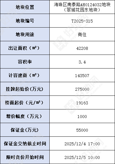 另外,地块容积率3.4,为除去年出让的琶洲南区四宗宅地(即“保利天奕”项目地块,容积率均为2.5)外,2024年至今海珠区推出容积率最低的一宗涉宅地。