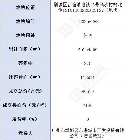 好地网11月10日消息(研究员 黄卓贤)今天,广州出让1宗宅地,位于增城区新塘镇,最终由广州市增城区东进城市开发投资有限公司(增城城投)以底价80510万元竞得,成交楼面价7130元/㎡,实际楼面价7292元/㎡。