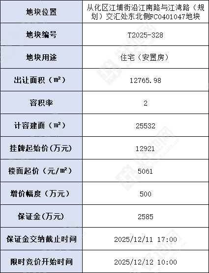 地块出让面积12765.98㎡,容积率2,建筑面积25532㎡,起价12921万元,楼面起价5061元/㎡,保证金2585万元,到账截止时间12月11日17时。