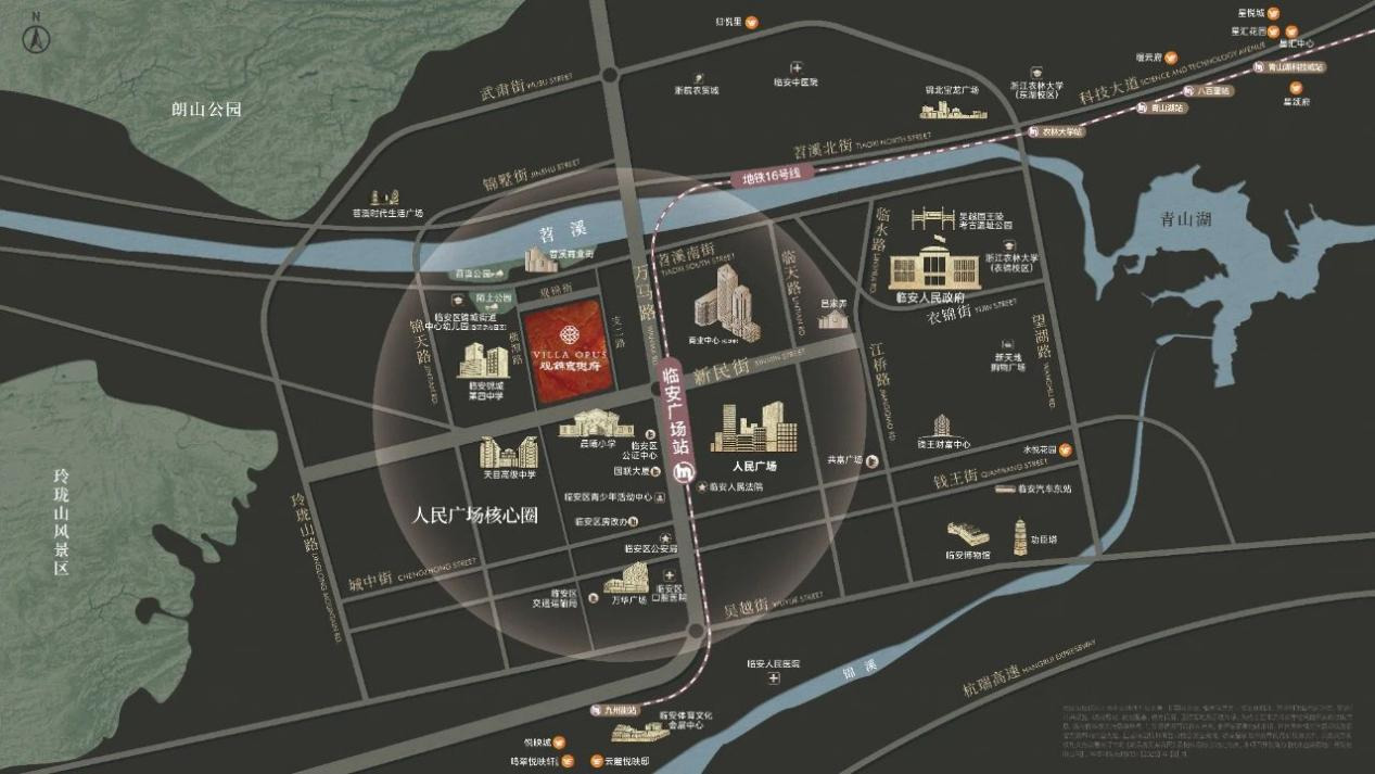 越秀·观锦宸樾府并不是传统意义上的“郊区盘”,而是镶嵌于临安主城核心的“城中院”。项目位于临安主城芯的锦城街道,距人民广场仅约500米,北侧就是临安的母亲河苕溪,距地铁16号线临安广场站直线距离约500米。
