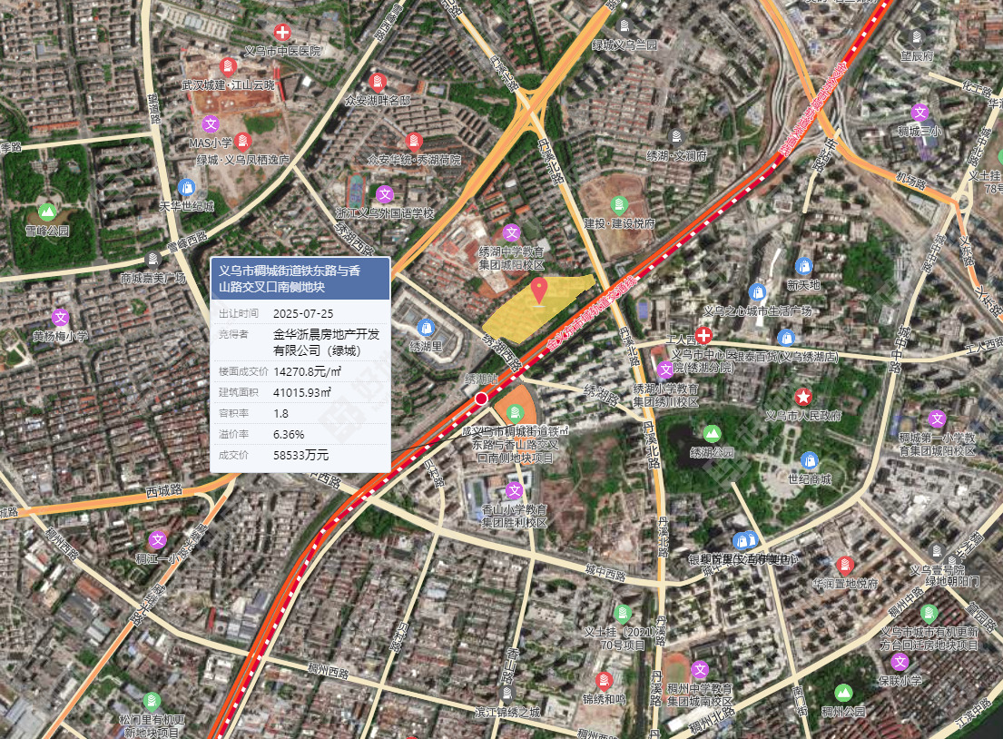 地块西南侧,今年7月25日,金华浙晨房地产开发有限公司(绿城)以总价58533万元竞得义乌市稠城街道铁东路与香山路交叉口南侧地块,楼面价14271元/㎡,溢价率6.36%。