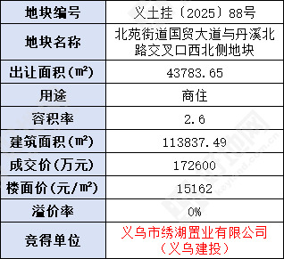 义乌市绣湖置业有限公司(义乌建投)以底价172600万元竞得义土挂〔2025〕88号地块,楼面价15162元/㎡。
