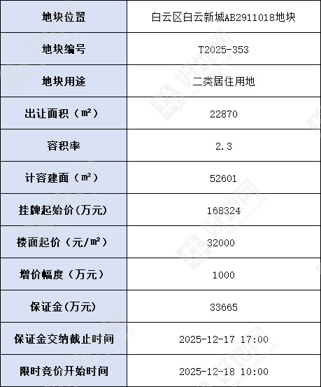 地块起价168324万元,楼面起价32000元/㎡,保证金33665万元,到账截止时间12月17日17时。