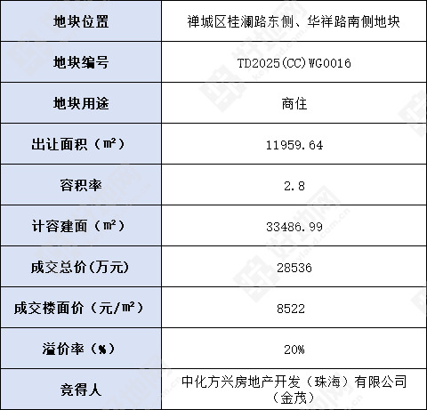 好地网11月20日消息(研究员 林嘉辉)今天,佛山出让1宗涉宅地,位于禅城区桂澜路东侧、华祥路南侧,最终由中化方兴房地产开发(珠海)有限公司(金茂)以总价28536万元竞得,成交楼面价8522元/㎡,实际楼面价8623元/㎡,溢价率20%。