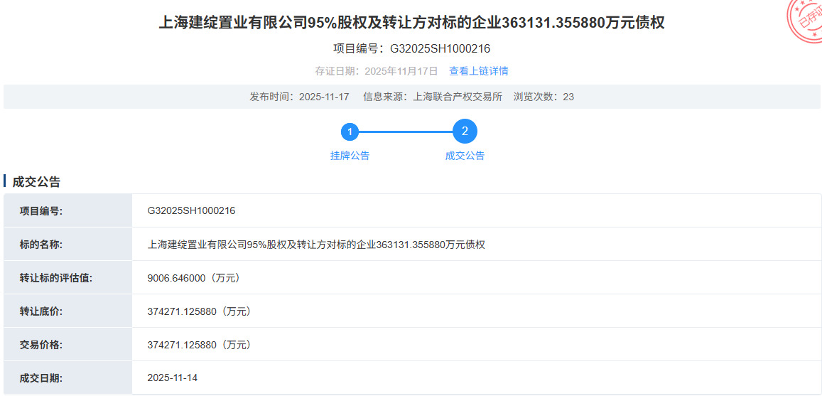 中建三局所属中建壹品商置联合湖北联投竞得上海建绽置业有限公司95%股权及转让方对标的企业363131.355880万元债权,成交总价374271.12588万元。