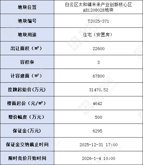 好地网12月3日消息(研究员 林嘉辉)今天,广州市挂牌1宗安置房地块,位于白云区太和镇未来产业创新核心区,拟于2026年1月4日10时进行限时竞价。