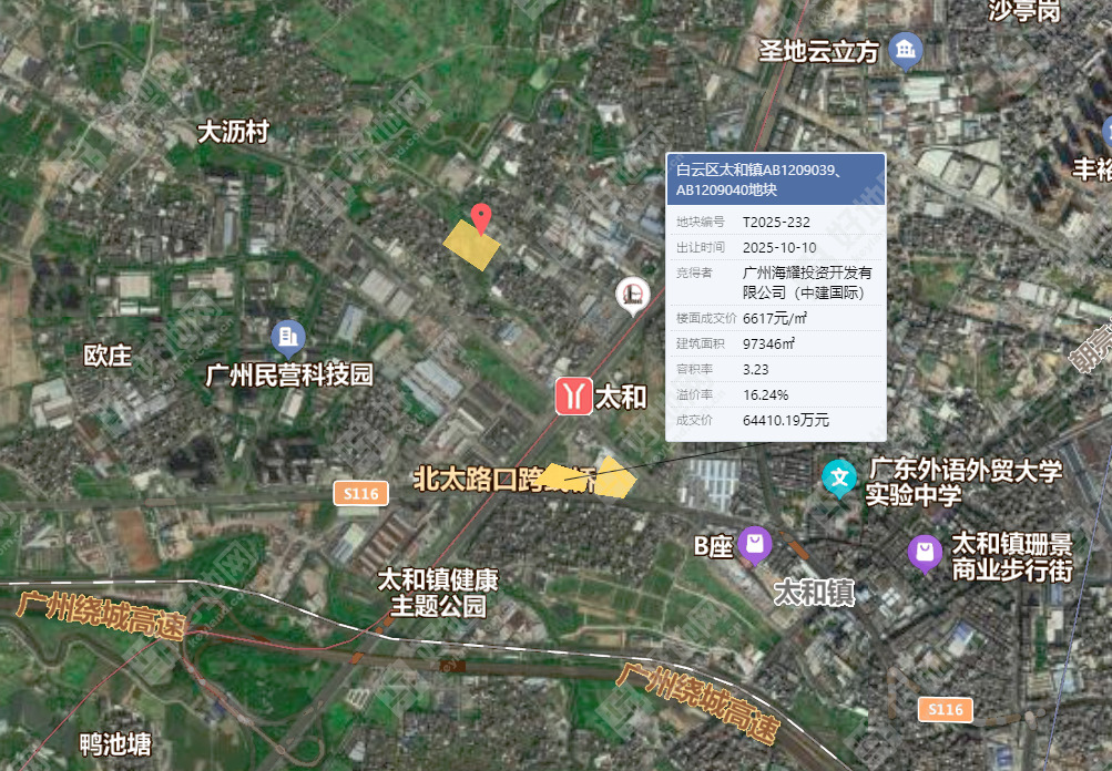 2025年10月10日,距离地块约800米,同为安置房地块的太和镇AB1209039、AB1209040地块,吸引至少3家企业参拍,经过15轮竞价,最终由中建国际以64410.19万元竞得,溢价率16.2%,成交楼面价6617元/㎡。