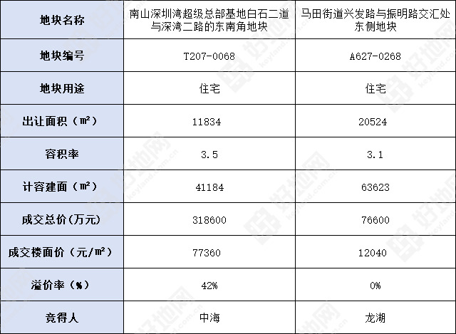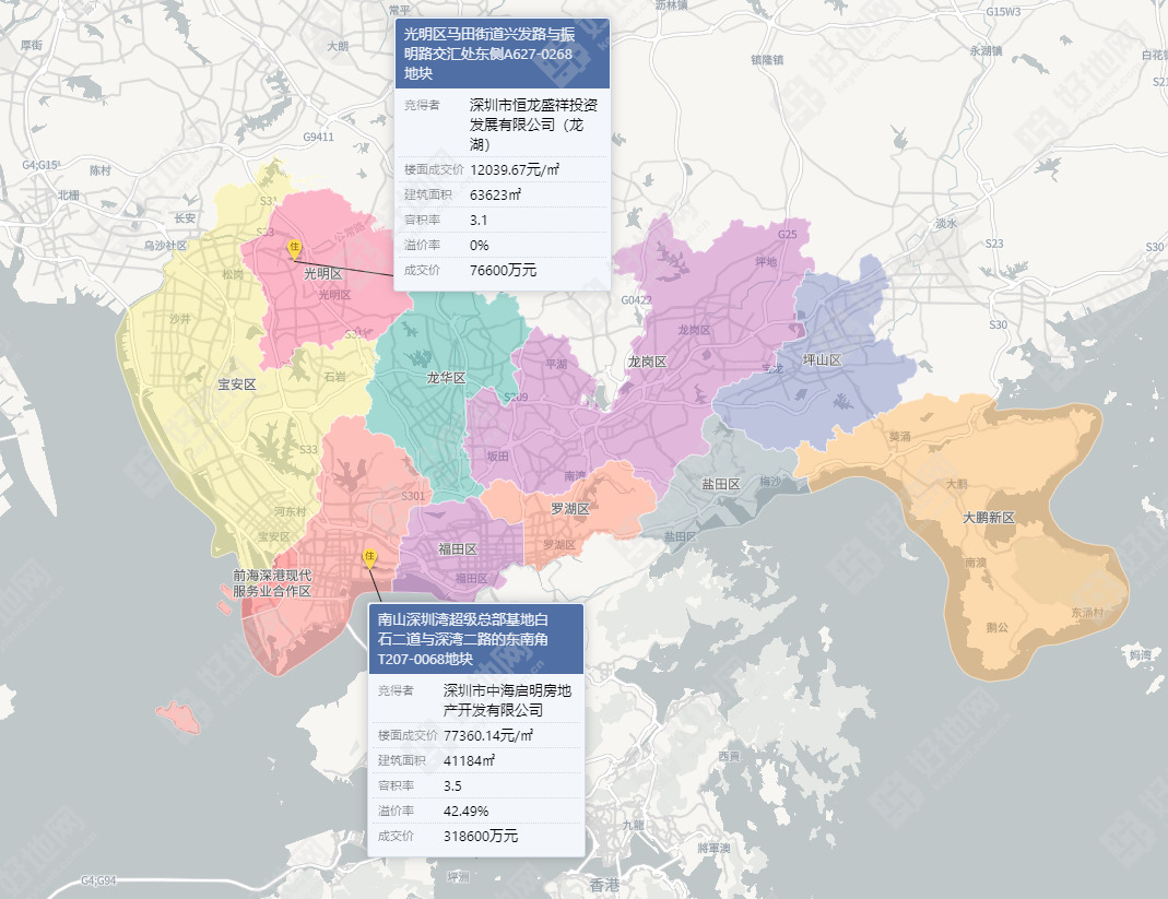 好地网12月8日讯(研究员 宣烨锋)今天,深圳市出让2宗涉宅地,分别为南山区深圳湾超级总部地块、光明区马田街道地块,最终由中海与龙湖两家房企共以395200万元分食。