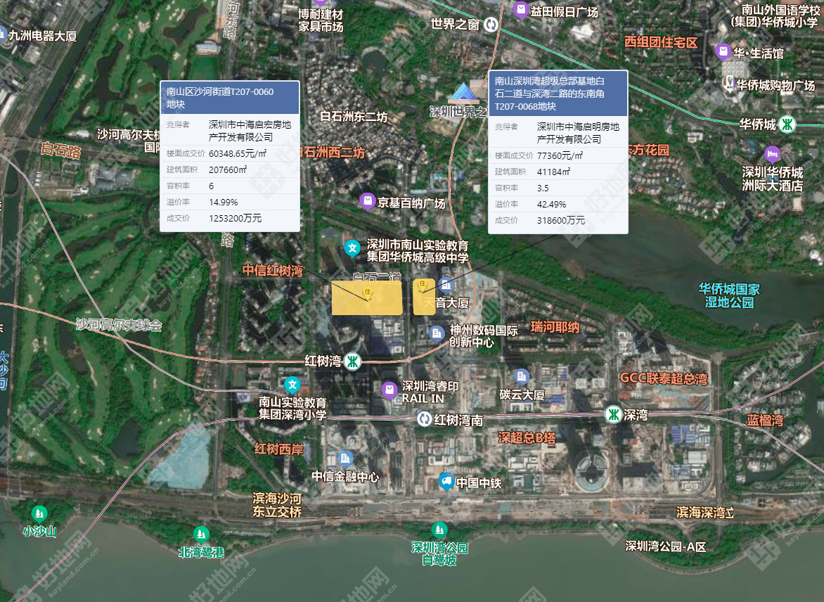 其中,南山深圳湾超级总部地块,吸引华润、中海、招商&南山、华发、保利置业、建发等六组房企参拍。经过101轮线下报价,地块最终由深圳市中海启明房地产开发有限公司(中海)以318600万元竞得,溢价率42.5%,成交楼面价77360元/㎡,实际楼面价85100元/㎡。