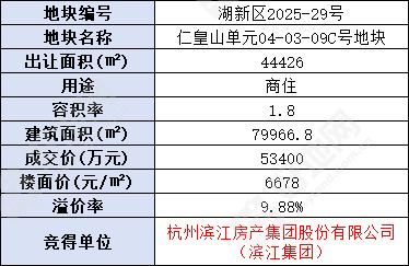 好地网12月25日消息(研究员 孙航海)今天,湖州吴兴区出让1宗商住地,最终溢价9.9%,由滨江集团以总价5.34亿竞得,楼面价6678元/㎡。