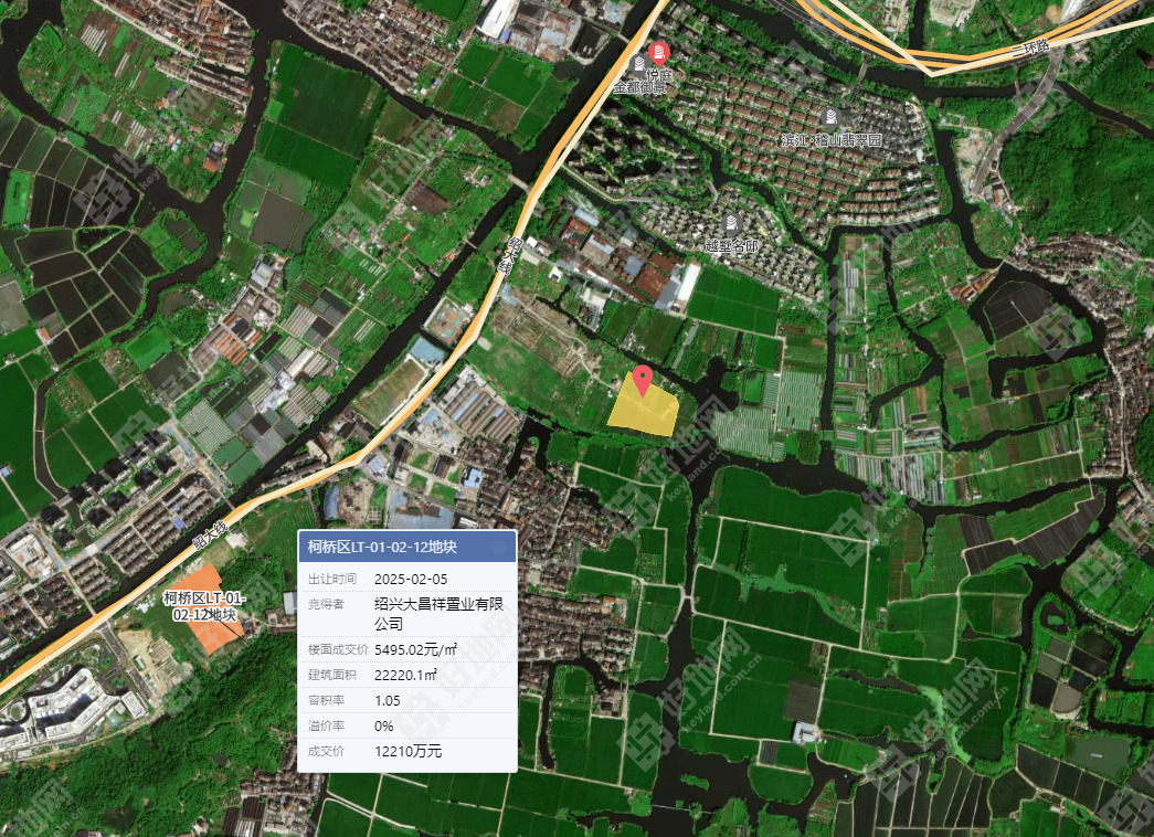 地块西南方向1.1公里处,今年2月5日,绍兴大昌祥置业有限公司以底价12210万元竞得柯桥区LT-01-02-12地块,楼面价5495元/㎡。