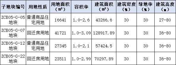 其中,05、12两宗为商品房用地,总出让面积4.39公顷,总建筑面积约10万方;07、22两宗为回迁房用地,总出让面积6.52公顷,总建筑面积约19.9万方。