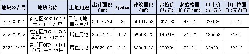 首批挂牌3宗涉宅地,分别位于徐汇区长桥板块,嘉定区嘉定新城和青浦区西虹桥,总出让面积151亩,总建筑面积19.8万方,总起价664414万元。