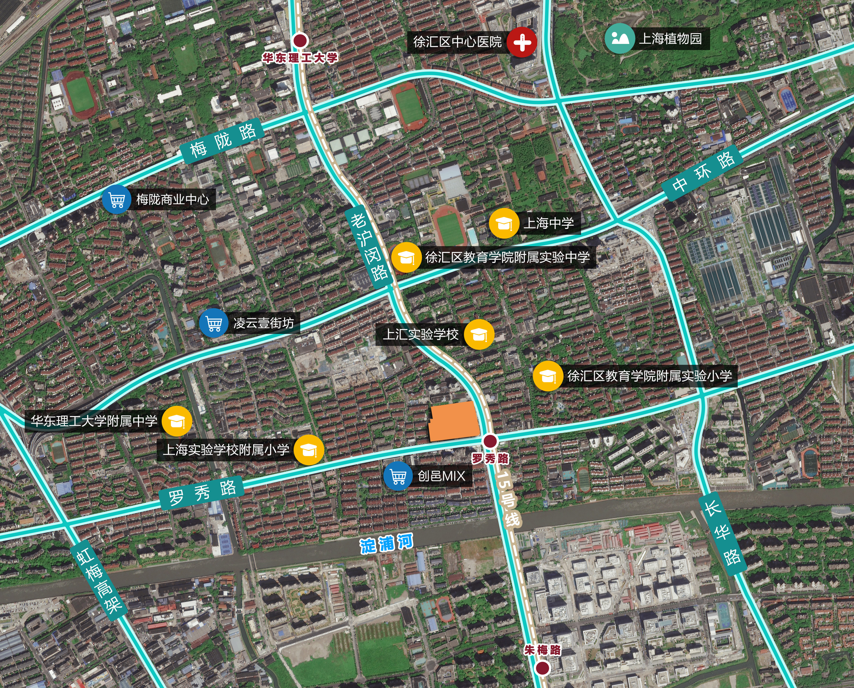 基础教育:地块 500 米范围内聚集徐汇区教育学院附属实验小学、上汇实验学校等教育资源;1公里范围内聚集上海幼儿园、长桥第一幼儿园、长桥第二幼儿园、长桥第三幼儿园、陇龙幼稚园、晶华坊幼儿园等幼儿园;上海小学、上海实验学校附属小学、蔷薇小学等小学;上海中学、徐汇区教育学院附属实验中学、华理附中等中学。