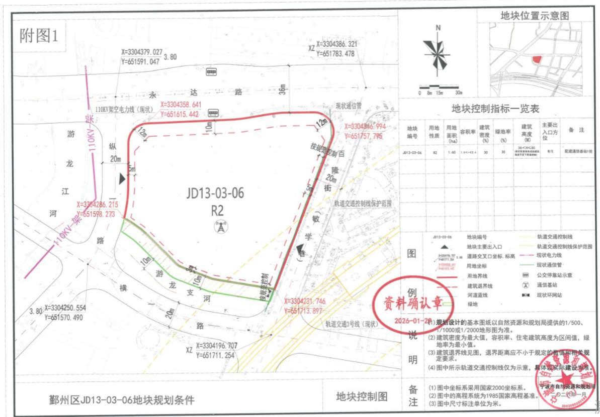 地块位于鄞州区仇毕东郊街道,根据规划条件,地块土地用途为城镇住宅及配套用地,出让面积为1.6万㎡,总建筑面积3.8万㎡,容积率2.4,建筑高度限定在36米至80米,可打造小高层与高层组合产品。