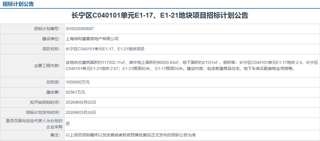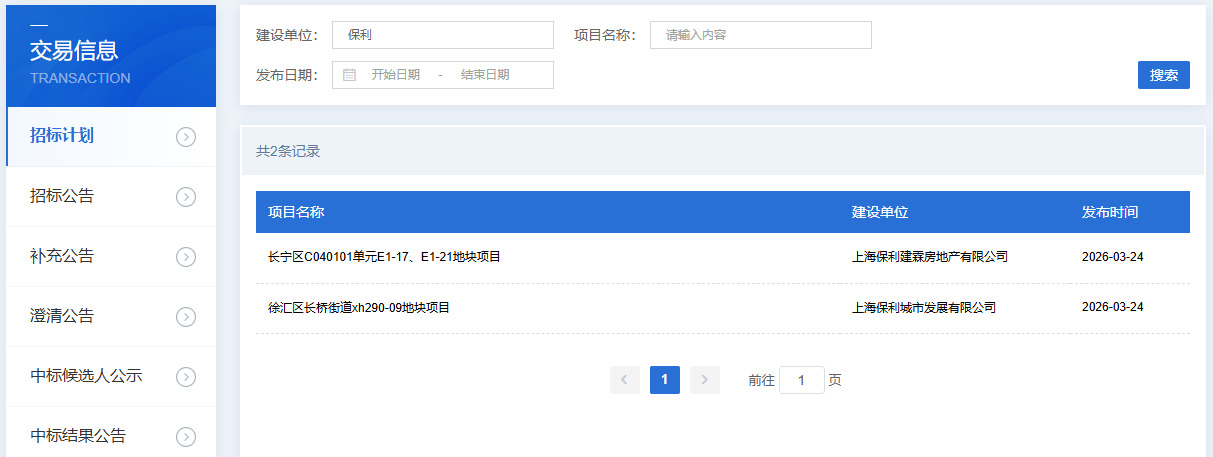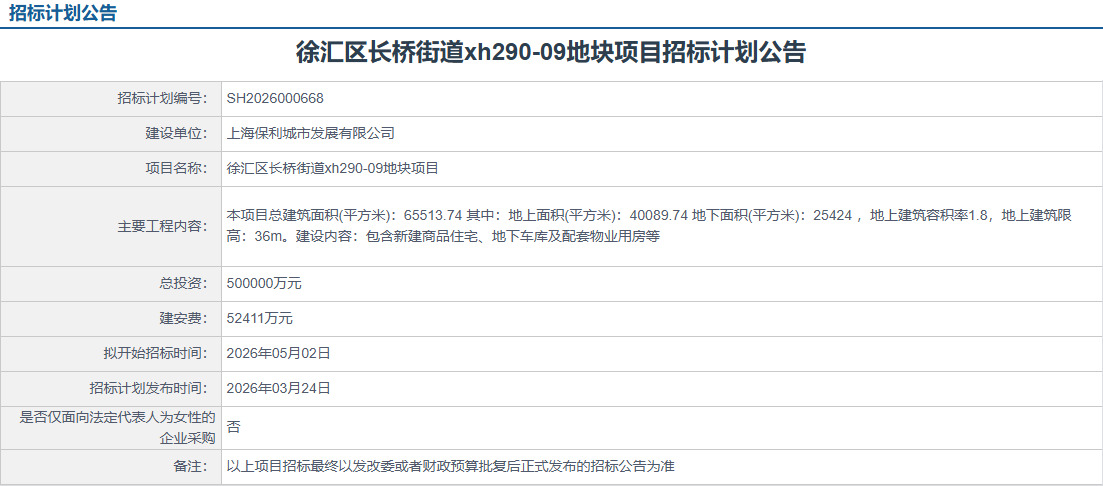 好地网3月25日消息(研究员孙航海)日前,保利发展在上海市建设工程交易服务中心上发布2则招标计划公告,计划投资150亿元建设徐汇区长桥板块和长宁区中山公园宅地。