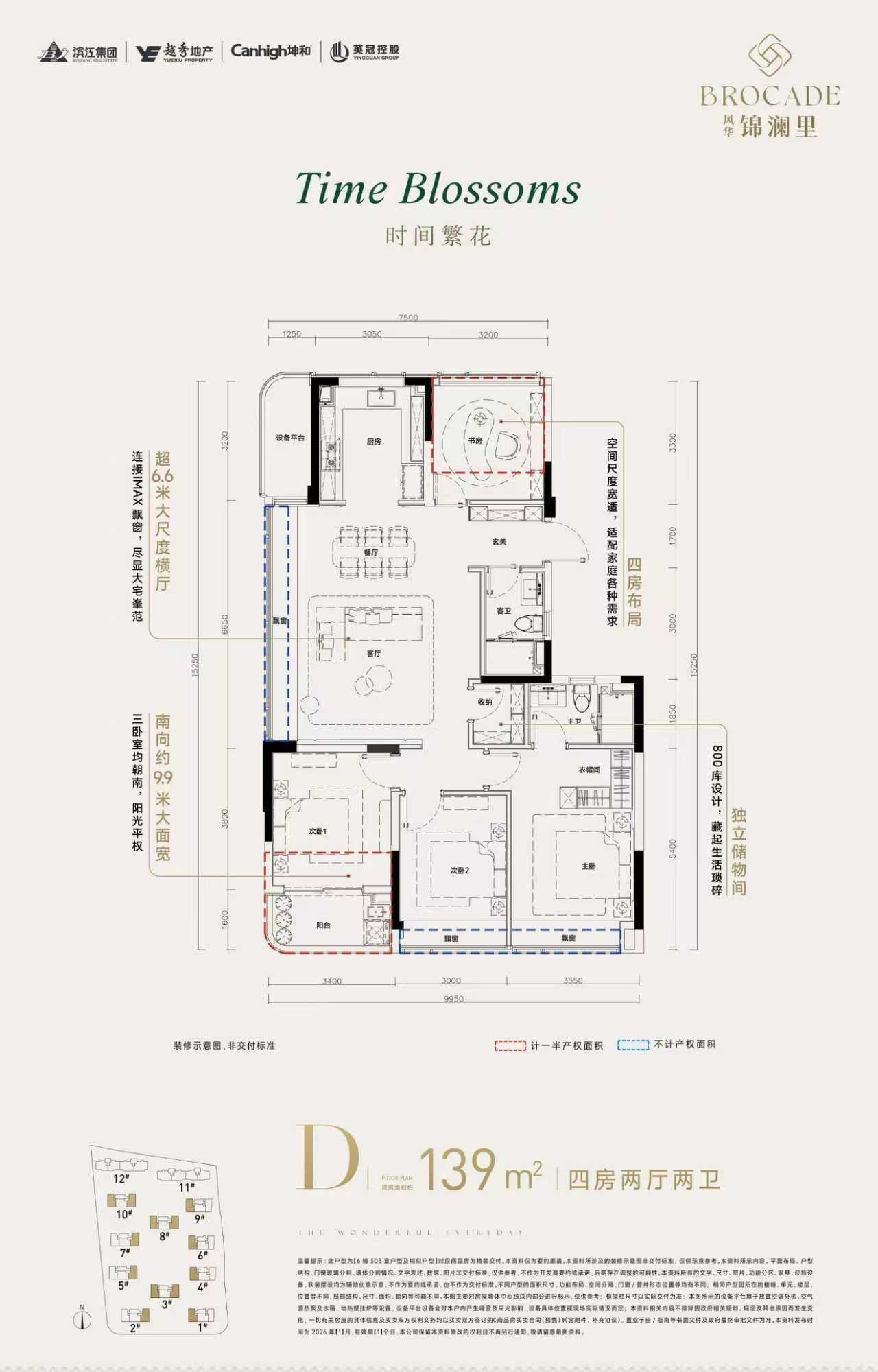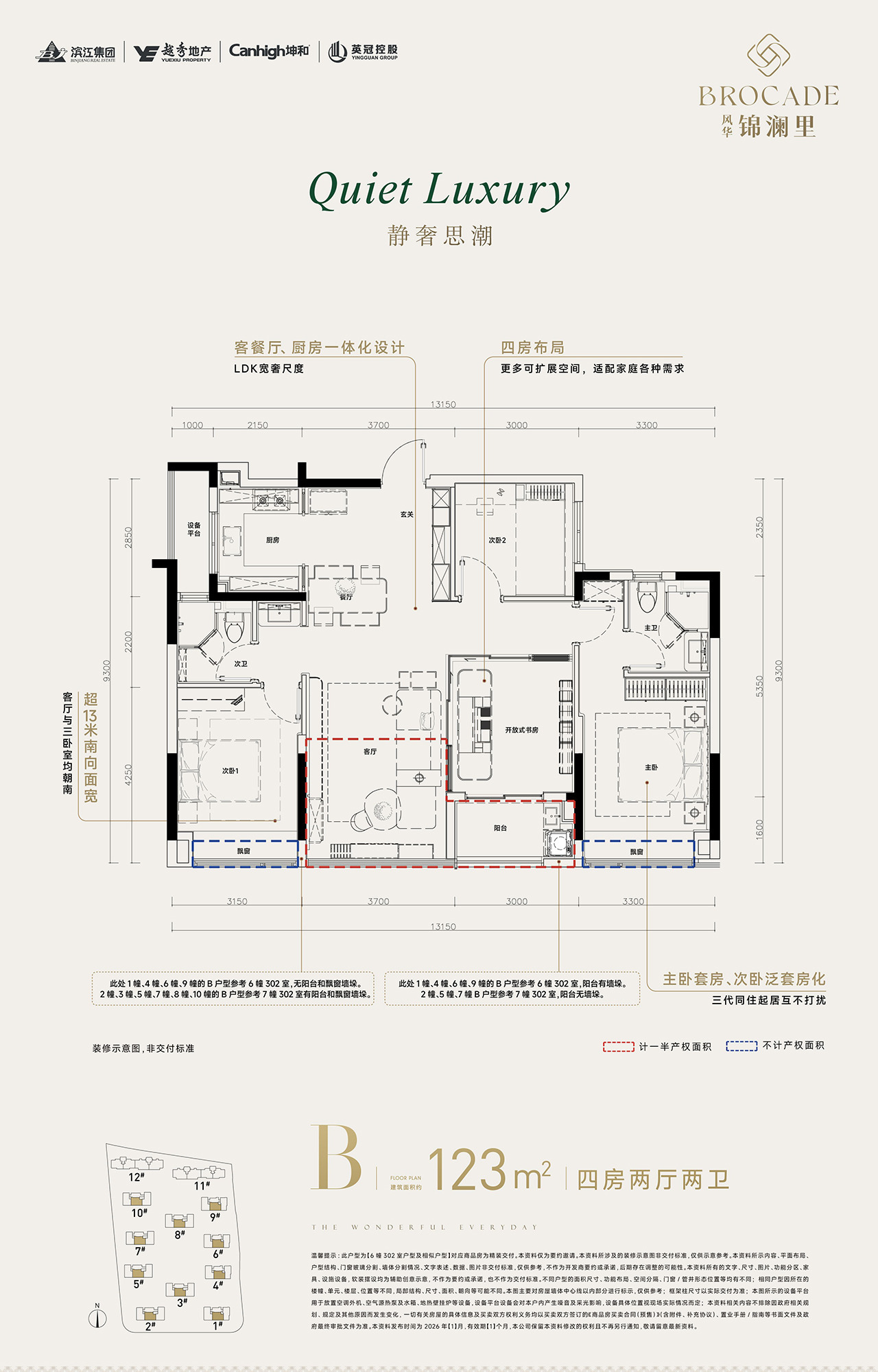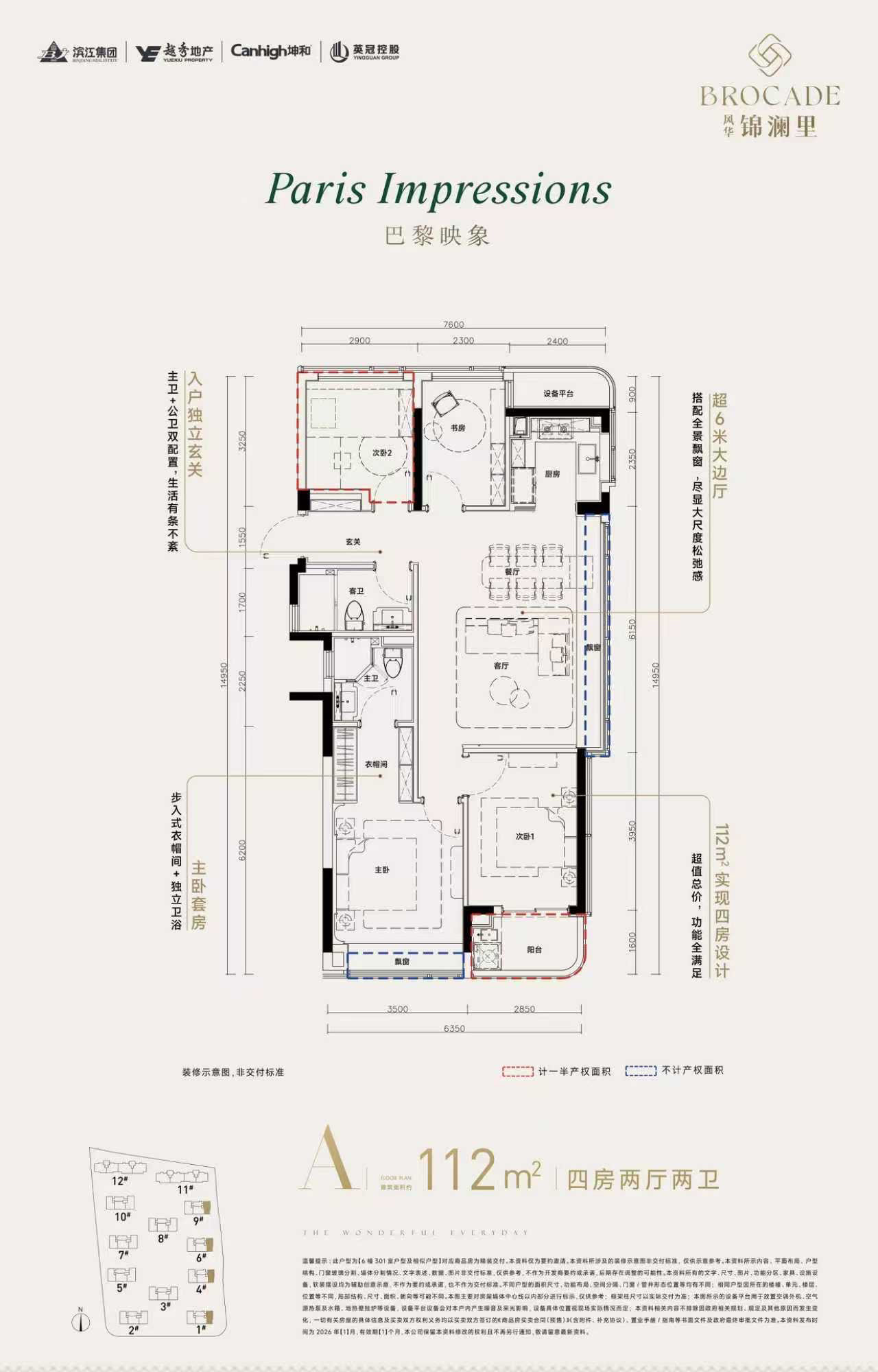 户型赠送空间多,112-123㎡设计出4房,实际得房率90-92%,南北大面积落地窗。