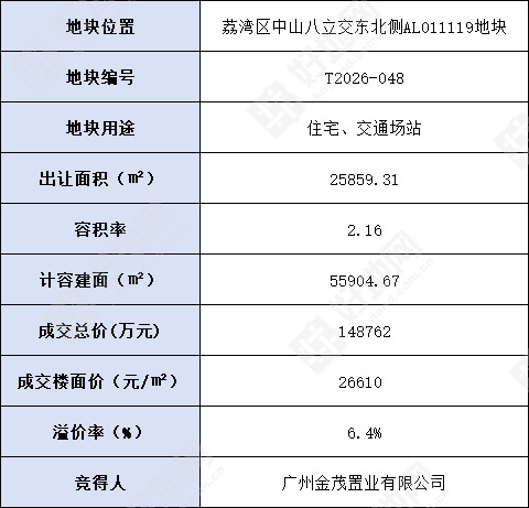 最终经过10轮线上竞价,地块由广州金茂置业有限公司(金茂)以总价148762万元竞得,溢价率6.4%,成交楼面价26610元/㎡,实际楼面价30165元/㎡。