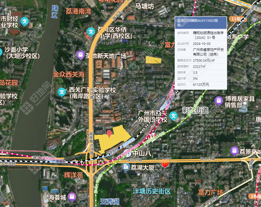 今天金茂拿地实际楼面价30165元/㎡,2024年10月30日,越秀以总价61125万元竞得相距600米的荔湾区河柳街地块(即越秀·珑悦西关项目),成交楼面价27500元/㎡,实际楼面价30390元/㎡,地价基本持平。