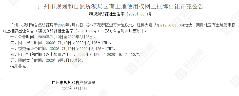好地网8月12日消息(见习研究员 黄卓贤)今天,广州市公共资源交易中心发布公告,将原定于8月17日出让的位于花都区迎宾大道以北、红棉大道以东G12-XH03、04地块二期地块,保证金缴纳截止时间以及出让时间延后,具体为: