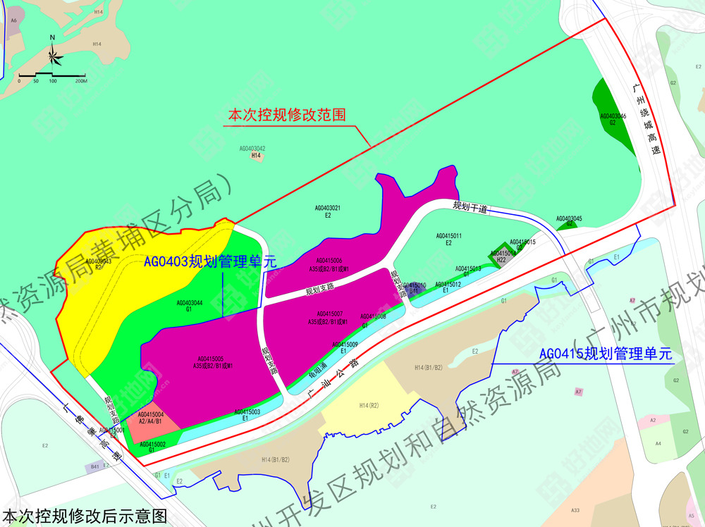 本次控规修改范围位于广汕公路以北、广州绕城高速以西、广佛肇高速以东,用地面积112.88公顷。涉及AG0403、AG0415两个规划管理单元。