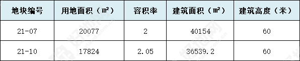 21-07地块用地面积20077㎡,容积率2,建筑面积40154㎡,建筑高度60米;21-10地块用地面积17824㎡,容积率2.05,建筑面积36539.2㎡,建筑高度60米。