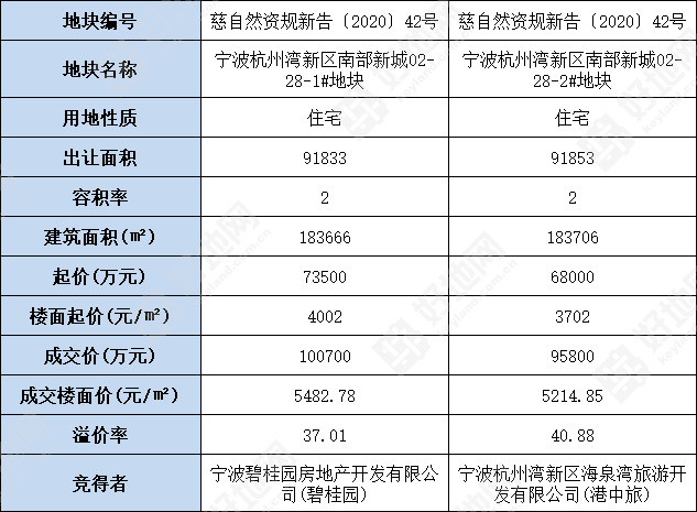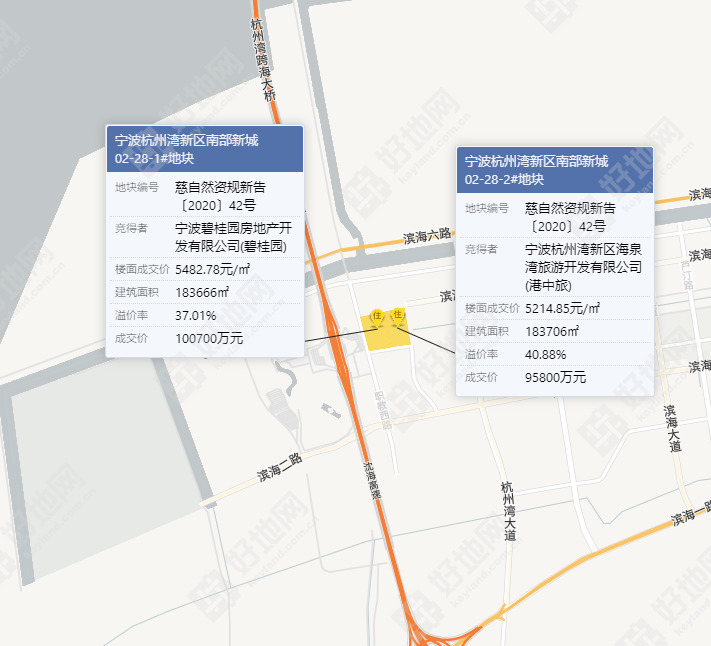 2宗地块位置相邻,距地块东北侧约1.3公里处,宁波杭州湾滨海新城开发建设有限公司于今年1月15日竞得宁波杭州湾新区智慧宜居区块10#地块,总价82000万元,楼面价4021元/㎡,溢价率25.19%。