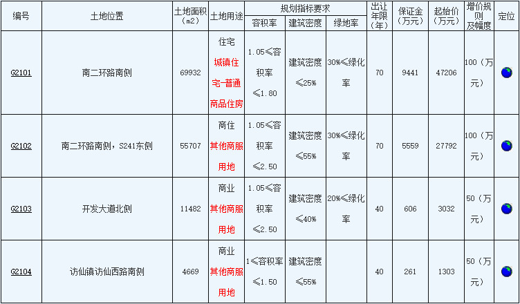 (一)G2101地块的竞得人须按花王片区控制性详细规划要求,建设大型购物中心并整体自持,不得对外分割销售,具体要求详见附件《G2101地块投资发展监管协议》。 (二)G2101地块的竞得人须无偿代建: 1、地块西侧道路(南二环路——新丰路):按国家相关标准建设。包含道路工程、管线工程(包含雨污水、路灯等)、绿化等附属工程。 2、社区用房:用地面积约4181㎡,总建筑面积不少于4500㎡,包含土建、室外景观及附属工程等工程。其中地上建筑面积不少于3500㎡,地下建筑面积不少于1000㎡。 3、代建道路和社区用房用地以划拨方式供地,土地划拨、工程建设和移交等所需税费由乙方支付。建设方案报丹阳市人民政府批准后,与地块内首期建设的居民住宅同步规划、同步设计、同步建设、同步验收,竣工验收合格后整体无偿移交给丹阳市人民政府,产权归丹阳市人民政府所有。 (三)G2104地块的竞得人须根据访仙镇控制性详细要求建设商业综合体,具体要求详见附件《G2104地块投资发展监管协议》。 (四)本次挂牌活动竞买G2101地块设定最高限价70806万元,G2102地块设定最高限价41692万元,达到最高限价的地块仍有两个或两个以上的竞买人愿意继续竞价的,转入现场摇号,摇号时间为5月14日15时,地点为丹阳市自然资源和规划局。