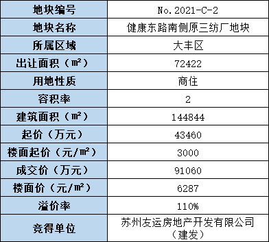 经过270轮竞价,苏州友运房地产开发有限公司(建发)以91060万元竞得该地块,溢价率110%,楼面价6287元/㎡,创大丰区楼面价新高。