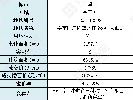 好地网12月6日讯(研究员 周吉羊) 今天,上海嘉定区成交1宗商业用地,由新渝商实业以1.98亿元竞得,楼面价31335元/㎡,溢价率422.28%。