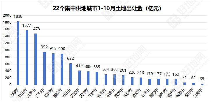 1-10月,上海市完成前三批集中供地出让,共成交60宗地块,总出让金1838亿元,位居全国重点城市出让金榜首。