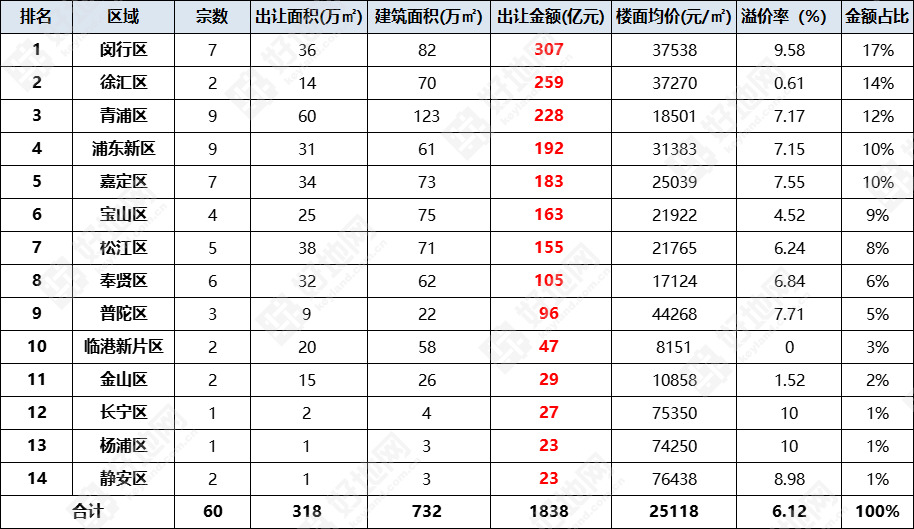 二、区域出让金排行:闵行307亿居首