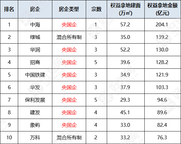 中海凭借三批次次轮竞得的徐汇区龙华地块,以204.1亿元跃居权益拿地金额榜首;