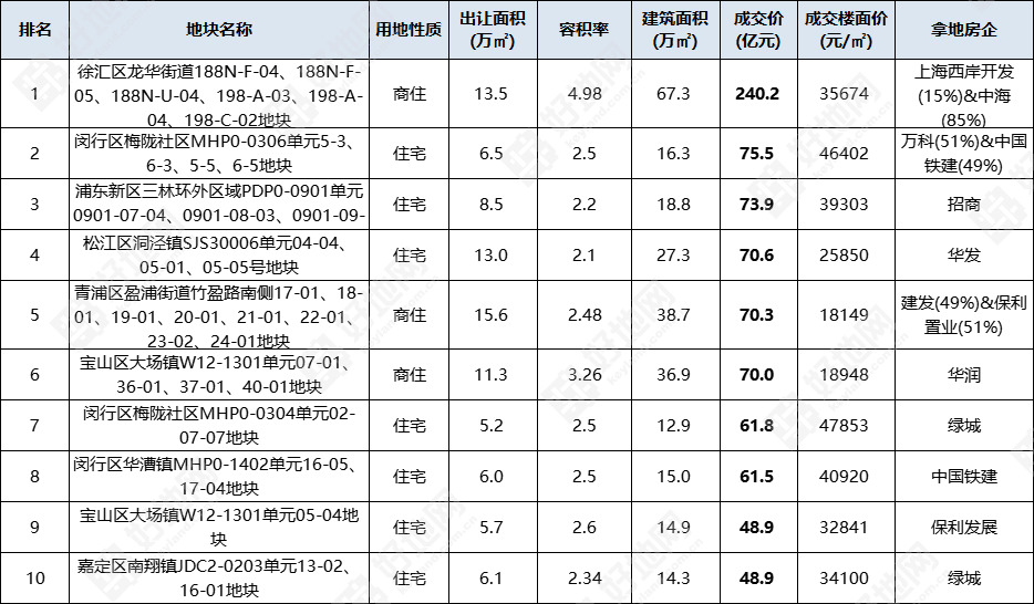 徐汇龙华地块成交总价最高,达240.2亿元,由上海西岸开发和中海联合竞得;闵行梅陇地块以75.5亿元位居第二,由万科和中国铁建联合竞得;浦东新区三林地块成交金额73.9亿元,位列第三,由招商拿下。