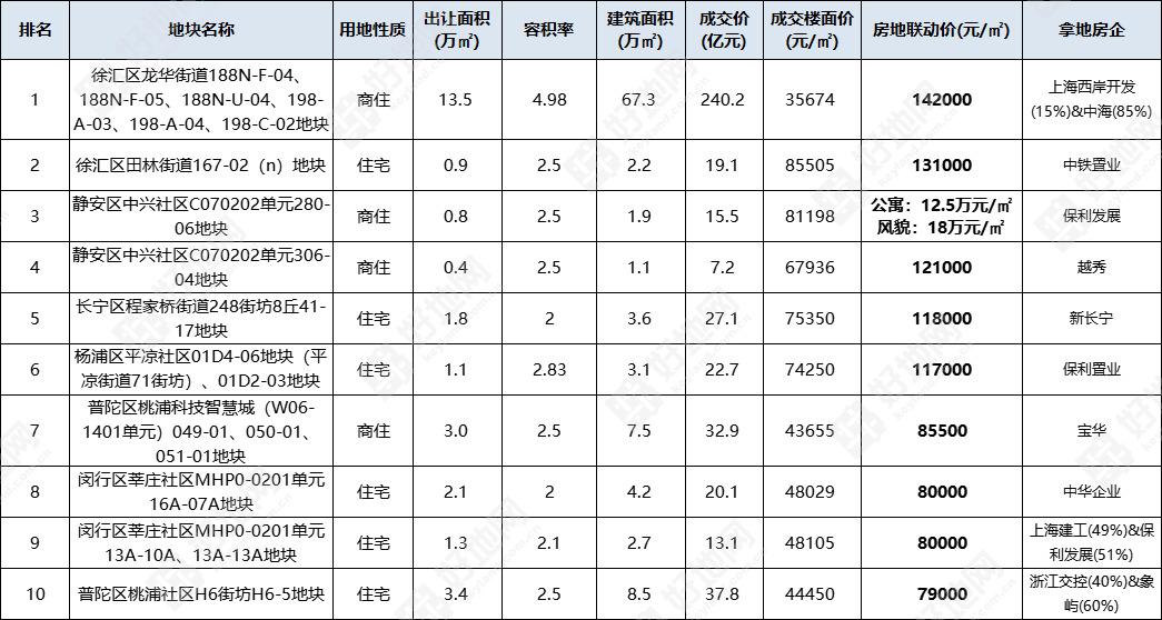 房地联动价最高的也是徐汇龙华地块,达14.2万元/m2;其次为徐汇田林地块,房地联动价13.1万元/m2;静安中兴社区280-06地块普通公寓房地联动价为12.5万元/m2,风貌则为18万元/m2。