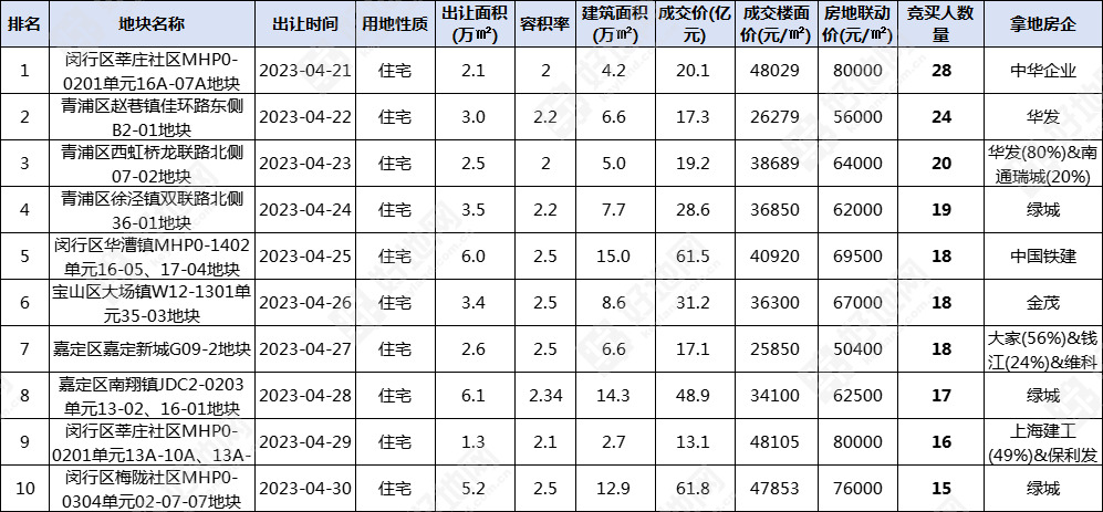 1-10月上海出让地块竞买人数排行榜