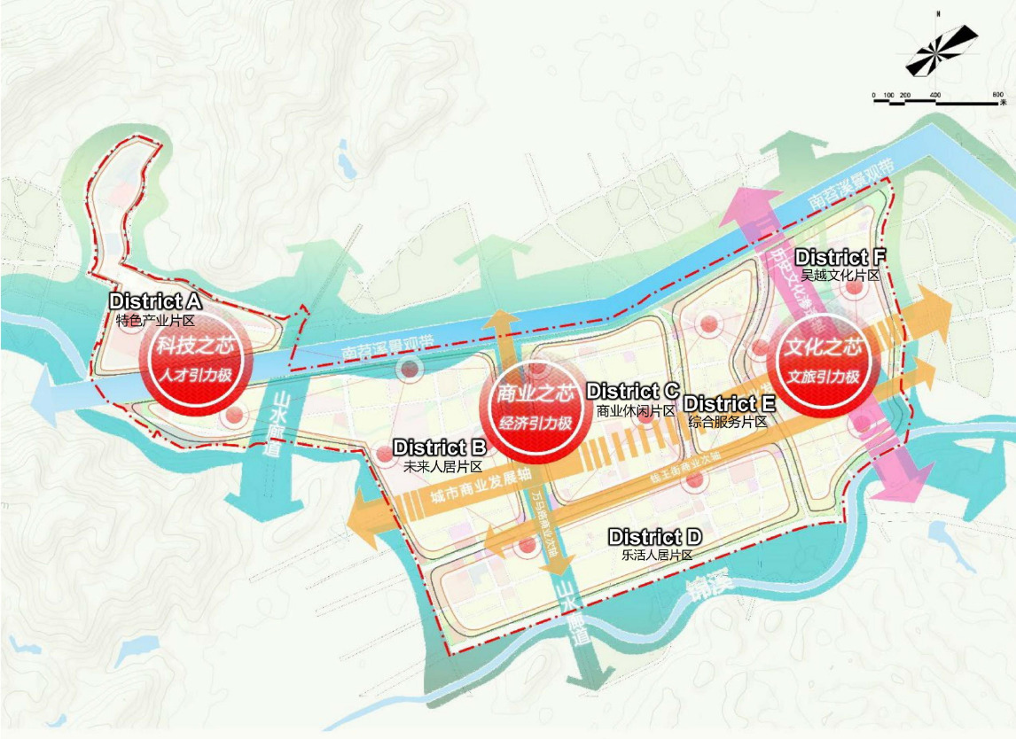 “六片”—特色产业片区、未来人居片区、商业休闲片区、乐活人居片区、综合服务片区、吴越文化片区。